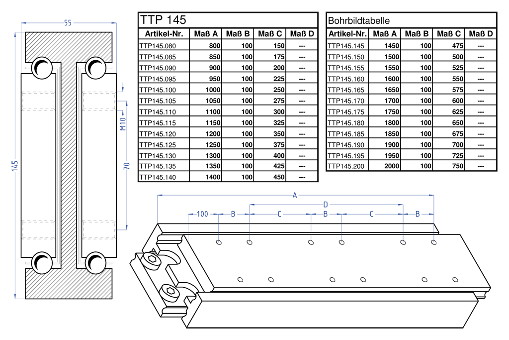 TTP 145-Vollauszug Der TTP 145-Vollauszug bietet sehr hohe Belastbarkeit. Die Befestigung erfolgt durch 12 Gewindebohrungen M10. Auszuglänge = Einbaulänge Gesamtlänge = Einbaulänge + Auszuglänge TTP-Vollauszug Typ: TTP 145 Artikel-Nr. TTP145....
