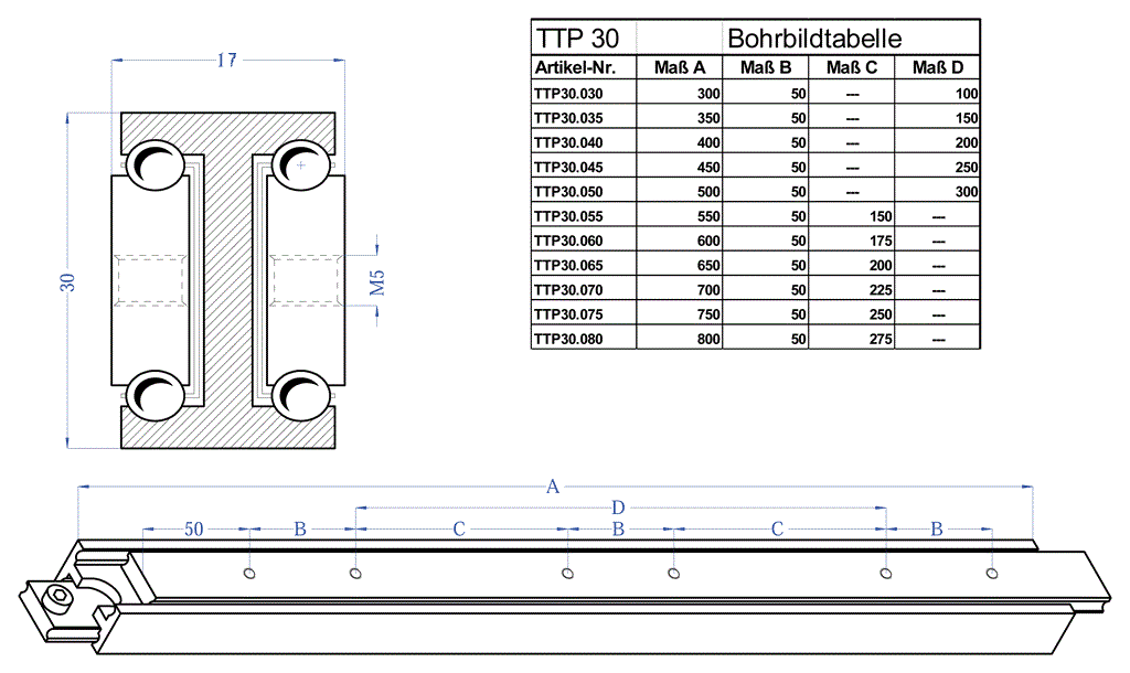 TTP 30-Vollauszug Der TTP 30-Vollauszug bietet hohe Belastbarkeit bei geringem Platzbedarf. Die Befestigung erfolgt je nach Länge durch 4 bzw. 6 in der Mitte liegenden M5-Gewindebohrungen. Auszuglänge = Einbaulänge Gesamtlänge = Einbaulänge + Auszuglänge TTP-Vollauszug Typ: TTP 30 Artikel-Nr. TTP30....